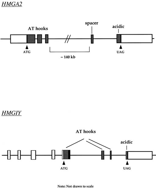 The architectural factor gene HMGA2 (at 12q15) was initially considered a positional candidate gene for leiomyomas after a series of FISH experiments identified a YAC that mapped to 12q15 and spanned the translocation breakpoints in uterine fibroid, pulmonary chondroid hamartoma, and lipoma specimens. HMGA2 had been mapped earlier to mouse chromosome 10, a segment of which is homologous to human 12q13–15.81 The relevance of this mapping data became apparent when transgenic mouse mutants were generated and showed aberrant growth leading to a pygmyphenotype, caused by disruption of the murine HMGA2 locus.82 These data, along with experiments showing a requirement for HMGA2 in cellular transformation, and the understanding that the protein acts as an accessory transcriptional factor combined to make HMGA2 an intriguing candidate gene in the study of mesenchymal tumors with t(12;14) rearrangements.83,84 In a study of lipoma specimens with 12q15 rearrangements, FISH analysis and rapid amplification of cDNA ends (RACE) experiments demonstrated that HMGA2 was in fact disrupted by the translocation and that chimeric fusion transcripts were produced.35 Soon afterward, HMGA1 (at chromosome 6p21, another site of consistent rearrangement in benign mesenchymal tumors) was evaluated as a candidate gene and determined to be involved in these tumors. Along with HMGA2, the HMGA1 protein belongs to the heterogeneous HMG family of nonhistone DNA-binding proteins. Within this family, three categories have been recognized: the HMG box containing HMGB-1/HMGB-2 (formerly HMG-1 and formerly HMG-2, respectively) proteins; the active chromatin-associated HMGN1/HMGN2 (formerly HMG-14 and formerly HMG-17, respectively) proteins; and the HMGA (formerly HMGI) proteins HMGA2 and HMGA1.85 As a group, HMGA proteins are known to bind to the minor groove of AT-rich DNA through a domain known as the AT hook. Through a combination of protein–protein and protein–DNA interactions, HMGA proteins appear to affect gene activity by modulating DNA conformation and regulating access of transcription factors to target genes. Both HMGA2 and HMGA1 have been shown to be phosphorylated by p34/cdc2-like kinases in a cell cycle-dependent manner, subsequently modulating the affinity of HMGA2 protein for DNA.86,87 Of the HMGA proteins, HMGA1 is the best characterized and has been shown to stimulate binding of NF-kB and ATF2 to the interferon B promoter by changing DNA conformation. As a result of HMGA1 action, NF-kB and ATF2 are able to interact with each other and with the basal transcriptional machinery. AT-rich sequences in the promoters of E-selectin, interleukin-2 receptor α-chain, the chemokine MGSA/GRO, and the class II major histocompatibility complex gene HLA-DRA have all been demonstrated to bind specifically and directly to the HMGA1 protein. HMGA2 and HMGA1 are both closely related as well as highly conserved (96% conservation between mouse and human HMGA2 homologues).88,89 Sequence analysis has shown that the first three HMGA2 exons are clustered within 13 kilobases of each other and together encode a DNA-binding domain comprising the AT hook motif (Fig. 2). A large intron (approximately 140 kilobases) between exons 3 and 4 separates the DNA-binding domains from the rest of the protein. Exon 4 encodes an 11-amino acid spacer domain that is absent from HMGA1 and precedes a 13-kilobase intron that separates it from the acidic domain encoded by exon 5. The entire HMGA2 gene spans approximately 160 kilobases, including a 327-base pair coding region, an 854-basepair 5' untranslated region (UTR) and a 2966-base pair 3' UTR, which together encode a 4.1-kilobase mRNA. In contrast, the smaller (10 kilobase) HMGA1 gene consists of eight exons: exons 1 to 4 are noncoding, exons 5 to 7 contain the AT hooks corresponding to exons 1 to 3 of HMGA2, and exon 8 encodes the acidic C-terminus of the protein. Alternate splicing of this gene results in two products, one of which is a variant lacking a 33-basepair segment between exons 5 and 6 and which is also absent from HMGA2. Despite the great structural similarity between HMGA2 and HMGA1, expression patterns of the two proteins are strikingly dissimilar, perhaps suggesting the existence of distinct regulatory elements as well as different functional roles. In particular, it has been noted that increased levels of HMGA1 correlate with a malignant phenotype in a variety of tumors, including those of murine lung, thymus, and mammary epithelial cells.90 In human neoplasms, increased HMGA1 expression has been demonstrated in high-grade prostate tumors, thyroid carcinoma, and colorectal carcinomas. However, HMGA1 expression has also been seen in nonneoplastic animal cells, including rat fibroblasts and thyroid epithelial cells, as well as in numerous nonneoplastic human tissues, including heart, brain, lung, skeletal muscle, kidney, pancreas, spleen, thymus, prostate, testis, ovary, small intestine, colon, and leukocytes.88,91 In contrast, HMGA2 shows a limited expression pattern in a multitude of tissues and organs during murine embryogenesis with the notable exception of the brain, in which HMGA2 is expressed in a very restricted portion of the forebrain.92 In additional studies, RT-PCR analysis revealed expression of HMGA2 in many fetal tissues, including adrenal, aorta, bone brain, heart, intestine, kidney, liver, lung, muscle, ovary, placenta, skin, spleen, stomach, testis, and uterus. In contrast, HMGA2 expression in adult tissue was detected only in lung and kidney.93 It has been previously reported that HMGA2 expression is not detected in myometrium or karyotypically normal uterine leiomyomata. However, uterine leiomyomas with chromosomal rearrangements of 12q15 frequently express HMGA2. Recent data have demonstrated that HMGA2 expression was detectable in karyotypically normal uterine leiomyomas as well as in matched myometrium.94 The level of HMGA2 expression in karyotypically normal
