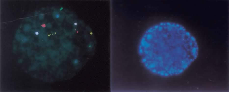 Performing preimplantation diagnosis has two technical components: removal of cells from the oocyte or embryo and the genetic diagnosis itself. Biopsy can be carried out on cells from the oocyte (polar body biopsy) and from the preimplantation embryo (blastomere biopsy). Both approaches require artificial reproductive procedures (in vitro fertilization [IVF]) to generate oocytes and embryos in vitro. Polar body biopsy involves removal of the first and second polar bodies. Blastomere biopsy involves aspiration of 1 or 2 cells (preferably 2 cells) from the cleavage stage embryo 3 days after insemination. Preimplantation diagnosis for genetic disease must be sensitive and rapid because genetic information is derived from 1 or 2 cells and human embryos must be transferred within 5 days of aspiration (blastocyst stage) to achieve implantation and pregnancy. The ideal method of studying chromosomes has been by karyotyping. Cells are arrested in metaphase by preventing spindle fiber formation, fixed in an acidified solution, and then treated to enzymatic digests (e.g. trypsin) so that chromosomes could be banded and that numeric and structural chromosome aberrations detected. To obtain metaphase chromosomes from polar bodies and cleavage-stage human embryos has been problematic, because these cells could not be cultured for extended periods of time (i.e. 2 to 3 days) and few cells were suitable for karyotyping. When metaphase chromosomes were obtained, the chromosomes were short and difficult to band. With the introduction of interphase fluorescent in situ hybridization, or FISH, examination of the chromosomes of every cell within an embryo became possible. FISH uses DNA probes that bind to specific regions of the target chromosomes. FISH probes directly labeled with different colored fluorochromes were developed which bind to the centromeric, or α satellite, regions of the X, Y, and 18 chromosomes, because each of their centromeres contained unique repeat sequences. After the nuclei chromatin had been denatured to separate the double-stranded DNA into single strands, the probes were then hybridized to their complementary strand. Because the fluorochromes were bound to the probes, a fluorescent dot was seen on the chromosome. Nuclei derived from sperm, oocytes, polar bodies, or blastomeres can be FISHed within two hours.1,2 For some chromosomes, however, centromeric sequences were not specific (e.g. the α satellite probe for chromosomes 13 and 21 cross hybridized and distinguishing the two chromosomes was not possible). When the number of signals indicated a numeric chromosome aberration, it was not possible to determine which chromosome was involved. In response to this technical problem, unique-sequence, single-copy FISH probes were introduced. Because they were specific for a single gene (i.e. locus specific), these probes were also chromosome specific. A significant disadvantage is that a limited number of chromosomes, usually no more than five, can be FISHed at one time, due to their close proximity within the interphase nucleus (Fig. 1). Chromosome aberrations occurring during gametogenesis, fertilization, and preimplantation embryonic development are in large part responsible for implantation failure, spontaneous abortion, stillbirth, and live birth with congenital malformations. Only 30% of human embryos during natural cycle conception are estimated to be able to implant themselves and become viable.3 More than 20% of these embryos in natural cycle pregnancies are believed lost before the third week of gestation.4 The rate of chromosome aberrations in spontaneously aborted fetuses following IVF was not dissimilar to that in natural cycle conceptions and exceeded 60%.5 Karyotyping of human preimplantation embryos following IVF revealed that 37% were chromosomally abnormal.6 Numeric chromosome aberrations were present in 56.5% of arrested preimplantation embryos, using FISH probes for only three chromosomes (X, Y, and 18).7 Because only 5% of 7- and 8-week-old embryos were found to be chromosomally abnormal,8 most embryos with a chromosome aberration are presumed to be lost before being recognized as a clinical pregnancy. This chapter reviews the origin and characteristics of chromosome aberrations in the preimplantation period with particular emphasis on their implications for the treatment of infertility by IVF and the preimplantation diagnosis of chromosome disorders. |