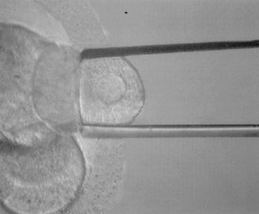In 1993, the first results of the clinical application of PGD for aneuploidy in combination with IVF treatment cycles were reported.9 Following ovarian stimulation and IVF, embryos underwent blastomere biopsy and chromosomal analysis, with the aim of selecting the embryos for transfer on the basis of their chromosomal condition. The original idea was based on the observation that women in advanced reproductive age experience a decline in implantation. Although several factors could be implicated, the main cause is represented by an increased risk of mitotic errors at oogenesis whose immediate clinical consequences are spontaneous abortion and implantation failure. Therefore, it was postulated that the identification of euploid embryos could reverse the age effect, and PGD for aneuploidy has been applied not only to reduce the incidence of trisomic pregnancies but also to improve the ongoing implantation rate by decreasing the occurrence of spontaneous abortion. The results obtained have confirmed that the tendency to develop aneuploid embryos increases proportionally to maternal age.10,11,12 Data have also shown that the incidence of chromosomal abnormalities in preimplantation embryos was notably higher than that reported in spontaneous abortions, indicating a strong selection against aneuploidy at implantation. This is confirmed by the finding that monosomies, with the exception of monosomy X and 21, are undetected in clinical pregnancy, although they occur at the same frequency as trisomies. It is conceivable that, in agreement with animal studies and in vitro culture of human embryos, monosomies arrest developing following human genome activation.13,14 Accordingly, the rate of blastocyst formation has been reported to be dependent on maternal age, with a decrease at older ages.15 All these data provided the molecular support to the already known decline in the reproductive performance depending on age. Impulse was given to the application of PGD for aneuploidy in couples with a poor prognosis of pregnancy, and categories of patients were identified who yield high proportions of chromosomally abnormal embryos.12,16,17 In some of them, the selection of embryos for transfer based on PGD demonstrated an increased implantation rate and a concomitant reduction in the incidence of spontaneous abortions owing to the highest viability associated with a normal chromosomal complement.17,18 The Technique PGD is performed on blastomeres biopsied from regularly developing day 3 embryos by removing one or two cells. The effects of biopsy on embryo viability had been studied at different stages in the mouse. Embryo damage as the result of the procedure itself was negligible, and the highest live birth rates derived from biopsy done at the eight-cell stage compared with earlier stages, possibly due to the reduction in the embryonic mass (1/8 instead of 1/4). Embryo biopsy is generally carried out at 62 to 64 hours after insemination. At this time, compaction starts to take place, and cellular damage is very likely to occur if the biopsy is performed when cell-cell interactions and junctions begin to assemble. Alternatively, embryos can be shortly incubated in a divalent cation–deficient medium. The biopsy procedure entails an opening in the zona pellucida of approximately 20 to 25 μm diameter, which is performed chemically, mechanically, or using contact laser. The position of the embryo is selected to have a nucleated blastomere at the three o’clock position that is removed by using a polished glass needle and gently released in the medium (Fig. 1). Extreme attention is taken to avoid rupture of the cell membrane and damage to the surrounding blastomeres. The biopsied embryo is removed from the biopsy disk, washed, and incubated in fresh medium, whereas the blastomere undergos genetic analysis.