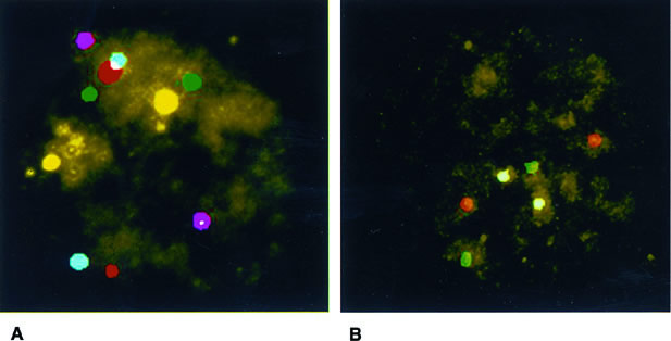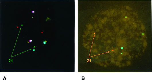Conventional karyotyping is not applicable to PGD owing to the low metaphase yield and the long time necessary for all the steps involved. The technique of fluorescence in situ hybridization (FISH) permits chromosome enumeration to be performed in interphase nuclei and, with the use of multiple probes, provides the diagnosis of different chromosomes that can be completed by subsequent rounds with additional probes (Fig. 2). In this way, diagnosis of nine or more chromosomes is currently available, including those that are more frequently associated with abnormalities in clinical pregnancies: XY, 13, 15, 16, 18, 21, and 22.19,20,21 This is done in a time frame compatible with IVF, and embryo transfer is normally performed on day 4 or day 5 with the purpose of (1) having enough time to complete the genetic analysis; (2) selecting embryos on the basis of morphology and PGD results; and (3) reducing the risk of losing blastomeres through the breach opened in the zona pellucida during the transfer procedure owing to more advanced compaction.22 The high risk of developing aneuploid embryos as well as the error rate inherent in one-cell analysis should prompt the physician to advise pregnant patients to undergo conventional prenatal diagnosis to confirm and complete the results obtained by PGD.23 Fluorescence In Situ Hybridization: Scoring Criteria The analysis performed on a single cell makes scoring criteria extremely important to enable a correct diagnosis. Basically, the distance between two signals specific for the same chromosomes must be at least two domains (a domain is represented by the diameter of a signal); if the distance is shorter, the pattern is considered to belong to split signals.24 Valuable information on FISH accuracy and for the formulation of scoring criteria derived from the analysis of all the blastomeres in nontransferred embryos.23,25 As represented in Table 1, 711 embryos were spread and their nuclei were fixed and analyzed with the same probes used for PGD. PGD results were confirmed in 91%; misdiagnosis occurred in 62 embryos but with a clinical relevance in only 31 (4%): 27 were erroneously classified as abnormal and 4 as normal; the remaining 31 carried an abnormality different from that diagnosed by PGD.