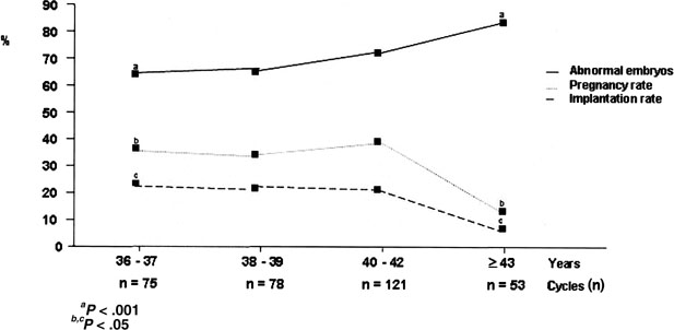 The proportion of chromosomal abnormalities increased proportionally to age, ranging from 64% in women ages 36 to 37 years to 86% detected in those aged 43 years and older. Pregnancy and implantation rates varied accordingly, with a significant decrease starting at 43 years (Fig. 4), implying that FISH selection reduces the effects of the age factor, providing the same reproductive performance to patients aged between 36 and 42 years.17 Other factors arise at older ages that may contribute to a reproductive decline; among them, a compromised uterine receptivity or the involvement in aneuploid events of chromosomes different from those tested.