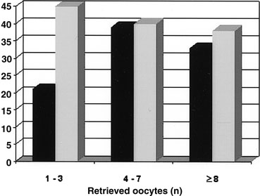 POOR RESPONDERS. Women with a poor response to hormonal stimulation demonstrated high percentages of chromosomally abnormal embryos (approximately 70%), implying that the great majority of the few embryos available are not compatible with healthy implantation.37 To evaluate the significance of this factor independently of female age, 137 PGD cycles with a maternal age of 35 years or younger were studied. Figure 5 represents the results obtained according to the number of retrieved oocytes that were arbitrarily divided in three categories: 1 to 3, 4 to 7, and 8 or higher. Probably owing to the small number of patients included in the first group, significant differences were not reached. However, there was a trend suggesting that in young, poor-responder women, the proportion of chromosomally normal embryos is extremely low (21%), with monosomy and trisomy contributing 45% of total abnormalities. If these data are confirmed, a strict correlation between ovarian environment and oogenesis could be postulated.