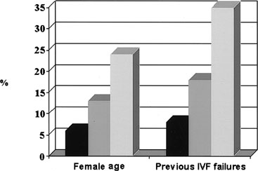 Repeated In Vitro Fertilization Failures Young patients with unexplained repeated IVF failures represent a challenge to IVF clinics. The idea of proposing PGD to them originated in the effort of identifying a possible cause of implantation failure.12,16 Detection of chromosomal abnormalities in 59% of the FISH-analyzed embryos indicated that the generation of numeric chromosomal defects could be one of the most important factors determining this poor prognosis condition. Table 2 reports the data yielded by 81 cycles; embryo transfer was performed in 62 cycles (76%), obtaining 20 clinical pregnancies (32%) and an implantation rate of 21.7%. The analysis of the detected abnormalities contributed to characterize this category of patients that substantially differ from the group of maternal age patients. The most frequent defects were complex abnormalities, haploidy, and polyploidy, which globally accounted for 67% of total abnormalities compared with 55% in patients with advanced maternal age (p <.001; Table 3). The incidence of polyploidy was especially high (12%) and occurred at the same frequency after intracytoplasmic sperm injection (ICSI) or conventional IVF insemination.30 These findings denote alterations in the events or structures entering cell divisions such as asynchrony between karyokinesis and cytokinesis or centriolar defects. The male gamete could play an important role in determining this condition, taking into consideration that the sperm-derived centriole and corresponding microtubule-organizing regions precede the first oocyte divisions.31 In addition, the sperm centrosome controls the plane of the first cleavage with critical consequences for the polarity and ploidy of the resulting embryo.32 Interestingly, the proportion of couples with a male factor infertility was 67% in the group of repeated IVF failures (47% in the group of patients with advanced maternal age); this could support the results obtained from the FISH analysis. This observation suggests that this group is probably heterogeneous as far as the main cause of reproductive failure is concerned. More data need to be collected and properly analyzed to verify whether a series of concomitant factors or chromosomes different from those tested could contribute to this poor prognosis condition.