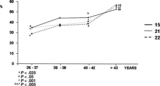 Besides the clinical relevance of PGD for aneuploidy, this technique has also contributed novel information on early embryology. Two are especially relevant, namely (1) the association between ploidy and embryo morphology and (2) the frequency at which specific chromosomes give rise to aneuploid events. A normal chromosomal complement is mostly associated with a regular morphology. Embryos with seven or eight cells at 62 hours postinsemination with less than 10% fragmentation, absence of multinucleation, or cytoplasmic concentration have the best chances (around 50%) of being chromosomally normal.40 Nevertheless, the tendency in patients with PGD indications to generate high rates of abnormalities does not preclude the possibility of aneuploidy, even in embryos developed to morphologically normal blastocysts.14,26,40 These findings suggest that morphologic criteria alone are of limited value in these patient categories. One-cell diagnosis imposes strict limits on the number of chromosomes to be tested. Data from spontaneous abortions and live births were obviously taken into consideration, and the probes for the aneuploid chromosomes most commonly found were included in the hybridization mixture. However, the analysis of PGD data has started to bring some queries about the selection of chromosomes that are currently screened. It is now clear that the frequency at which chromosomes originate aneuploidies occurs at different rates for each chromosome. In the group with an age factor, in which segregation errors are more likely to occur, chromosomes 1, 15, 16, 17, 21, and 22 exhibited the highest rate of variation (Table 7); there was a proportional increase in relation to age for the chromosomes 15, 21, and 22 (Fig. 7), chromosomes 1 and 17 were significantly lower in the youngest categories, whereas chromosomes 13, 14, 16, 18, X, and Y showed similar aneuploidy rates in all age groups.25,30 These data, extended to other chromosomes as well as to younger women, could provide valuable information on the chromosomes that are more prone to variation in the different age groups. It would also be possible to verify whether chromosomes exist whose numeric variations have such a deleterious effect on embryo viability to make this condition completely incompatible with implantation.