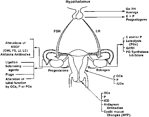 Development of new contraceptives for the female depends on a thorough knowledge of the anatomy and physiology of the reproductive tract. The female has five major roles in reproduction: (1) developing a gamete (ovum); (2) receiving the male gamete (spermatozoa) and transplanting them from the vagina to the distal portion of the oviducts; (3) supplying a suitable milieu for fertilization; (4) directing the fertilized ovum across the fallopian tubes to the uterine cavity; and (5) providing a uterine environment conductive to implantation and maintenance of gestation. These functions provide an excellent opportunity for biologic and pharmacologic manipulation of the female reproductive process to achieve fertility control. This chapter reviews potentially vulnerable sites in the complex reproductive events in the female (Fig. 1). |