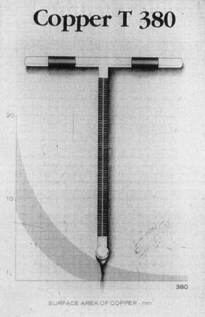 Currently there are two types of intrauterine contraceptive devices (IUDs) available in the United States: the copper T 380A intrauterine device (ParaGard T 380A Intrauterine Copper Contraceptive, Ortho Pharmaceutical, Raritan, NJ),1 and the levonorgestrel-releasing intrauterine system (Mirena, Berlex Laboratories, Montville, NJ).2 The copper T 380A intrauterine device (Fig. 1) is a T-shaped device composed of a polyethylene frame measuring 36 mm by 32 mm with 176 mg of electrolytic copper wire wrapped around its vertical stem and two copper sleeves of 68.7 mg of copper, placed on each of the horizontal arms, for a total surface area of 380 ± 23 mm2 of copper. The device has a monofilament polyethylene string tied at the base of the stem to create two tail strings that aid in monitoring device’s position and in its removal. The frame contains barium sulfate to permit radiographic visualization. The copper T 380A IUD is Food and Drug Administration (FDA)-approved for 10 years of use, although clinical studies indicate high efficacy for at least 12 years.3