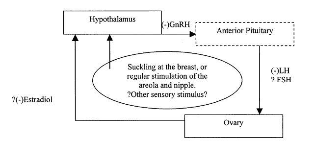The anatomy of the breast and the hypothalamic-pituitary axis for release of prolactin and the production of breast milk may be found elsewhere in this text. These same structures are integral to the mammary-hypothalamic-pituitary-ovarian axis that mediates lactational infertility. The current understanding of the physiology of this feedback system is derived from studies of the different systems under conditions of lactation and nonlactation. Because of the difficulties in studying of these phenomena, as previously outlined, this section summarizes current understanding and presents also a summary of studies that confirm the underlying conclusions presented here. Summary Suckling at the breast, especially with active stimulation of the nipple and areola and the structures that underlie them, stimulates a modification in gonadotropin-releasing hormone (GnRH) release from the hypothalamus, which in turn, disorganizes the pulsatility and levels of follicle-stimulating hormone (FSH) and luteinizing hormone (LH). The result of the disruption of the levels of LH, and the sometimes reduced levels of FSH, is suppression of the development and release of a viable follicle and ovum. If there is some follicular development and estradiol levels rise, there is a paradoxical resuppression of fertility, rather than the stimulation of ovulation seen in nonbreastfeeding women.5 Oxytocin release from the posterior pituitary, which stimulates the let-down reflex, allowing milk to flow through the capillary-like mammary tubules, has not as yet been linked to suppression of fertility; however, its establishment is necessary for successful lactation, and, as such, is a necessary part of the lactational infertility.6 Prolactin plays little role in this feedback system, and maternal nutritional status is much less important than the pattern of infant breastfeeding. Although much remains to be elucidated, the basic parameters of this feedback system may be seen in Figure 1.