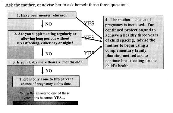 *Most pregnancy, or failure, rates as presented are from life-table analyses in studies of women who are not breastfeeding. These rates would be expected to be lower when used during breastfeeding due the additive impact of to its fertility suppressive effects. Pregnancy rates presented are based on studies of use during lactation. (Modified from Hatcher R, Rhinehart W, Blackburn R et al: The Essentials of Contraceptive Technology, pp 4---19. Baltimore: Johns Hopkins School of Public Health, 1997; and Labbock M, Cooney K, Coly S: Guidelines: Breastfeeding, Family Planning and the Lactational Amenorrhea Method. 2nd ed. Washington, DC: Institute for Reproductive Health, 1994) Nonhormonal methods are considered the first choice because they have no direct impact on breastfeeding. The lactational amenorrhea method (LAM), described later in this chapter, may be used as in introduction to other method selection, or as the primary method in the early months. In addition to LAM, the choices include physical, chemical, and temporal barriers, as well as male and female sterilization. Second choice is the progestin-only methods that have been extensively tested and found safe in later breastfeeding.30 In the last decade, possible association with maternal bone loss became an issue. A prospective study of levonorgestrel (Norplant), progesterone vaginal rings, and CuT380 intrauterine devices (IUDs) found no difference in bone status among the three groups at months 1 and 12 postpartum, and at 6 and 12 months after cessation of lactation.31 There are many studies of vaginal rings, a method not as yet approved for use in the United States, that show this to be a safe and efficacious method for lactating women, however, there remain issues of user satisfaction. The timing of introduction of progestin-only methods continues to be debated. There is little in the literature on the use of these methods during the first 4 to 6 weeks postpartum among fully breastfeeding women. Assessment of the studies available, clinical reports, and preliminary guidance from the WHO would encourage caution, recommending delay of use for at least 6 weeks postpartum, and calling for further research concerning this specific situation. The estrogenic methods, despite their higher efficacy, are considered third choice because of their known negative effect on milk production. Other concerns, such as changes in micronutrients, including iron, calcium, copper and phosphorus, seem unfounded.32,33 Consideration has been given to whether a woman should switch from the less efficacious progesterone-only methods to the estrogenic methods at some point during lactation. An opinion poll of 20 providers considered to be expert in the field concluded that there is no reason to switch during early lactation but that there is no problem with doing so after 6 months postpartum.34 Breastfeeding can significantly reduce menstrual loss and fertility, but alone, cannot provide reliable adequate child spacing for most women. Although further research is needed to understand all the neuroendocrine mechanisms underlying lactational infertility fully, clinical studies have outlined the parameters under which breastfeeding can be reliable. LAM should be considered an option in the complete picture of informed family planning choice for the lactating woman. Family Planning Based on the Physiology of Lactation There has been interest in building on lactational infertility to create a reliable, efficacious form of family planning for more than 25 years. In the 1970s, researchers began to publish studies showing that under clinical conditions of full breastfeeding and amenorrhea, fertility would be a rare event.20 At the same time, Tyson and others pursued the pituitary-gonadotrophin route, assessing the impact of thyrotropin-releasing hormone (TRH) and other related hormonal releasing hormones on fertility.35,36 More recently, it has been suggested that GnRH agonists might enhance the impact and duration of lactational infertility.37 These approaches that enhance or suppress the hormonal feedback system have been associated with acceptable side effects. Although there is a high correlation of the timing postpartum of fertility return with previous breastfeeding experience when measured in a population of women, this is not a reliable indicator for the individual. Stimulated by early publications, many researchers began to explore the relationship between breastfeeding patterns, menses return, and fertility suppression to see whether a noninvasive approach based on an improved understanding of the physiology might be possible. In 1988, the research findings of several centers around the world were shared at a meeting at the Rockefeller Bellagio Conference Center, and the scientists agreed that three criteria (i.e., full breastfeeding, amenorrhea, first 6 months postpartum) would be sufficient to serve as a method. These findings became known as the Bellagio Consensus.38 A few months later, this approach was presented to a group of family planning service providers at a meeting at Georgetown, in the District of Columbia, and LAM was developed as a clinical algorithm, and guidelines were prepared.39 LAM is a postpartum introductory method that includes three criteria for defining the period of lowest pregnancy risk and then advises immediate commencement of another method that complements the effects of breastfeeding thereafter. Clinically, the mother would be asked whether her menses have resumed, whether she is no longer fully or nearly fully breastfeeding, and whether the infant is 6 months of age or older. If the answer to any of these is affirmative, she is advised to begin another method of family planning, preferably one that will have no negative effects on lactation (Fig. 2). Counseling includes timely switch to another method compatible with lactation, and the encouragement of healthy birth spacing of about 2.5 to 3 years, allowing for maternal r
