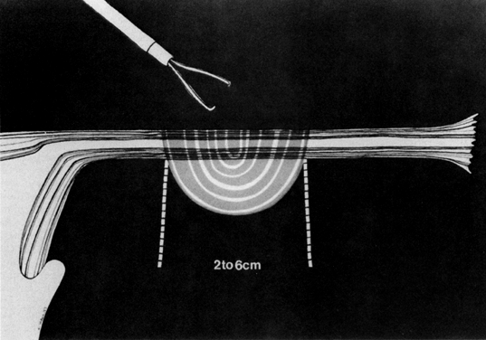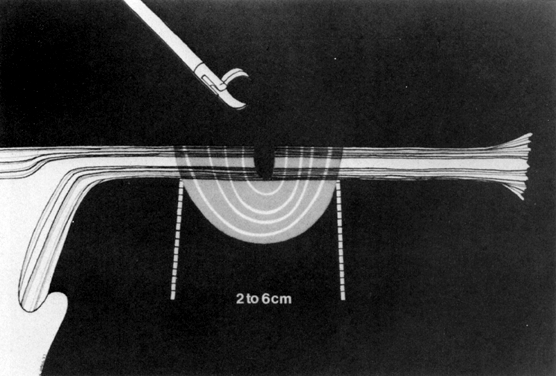 The equipment, procedures, and hazards of laparoscopic sterilization have been dealt with elsewhere. The following is a review of the various approaches to tubal occlusion, along with a discussion of their specific advantages and disadvantages. These techniques are presented in chronologic order of their introduction in the medical literature. Electrocoagulation UNIPOLAR. Although gynecologic laparoscopy was flourishing in Europe (only gastroenterologists were using the technique in North America), it was Anderson,4 an American, who in 1937 proposed laparoscopic electrocoagulation of the fallopian tubes to achieve female sterilization. However, it is Palmer5 of France who is credited with describing the modern technique of laparoscopic tubal electrocoagulation in 1962. The first instrument employed for this purpose was the Palmer biopsy forceps, because it was already adapted for electrosurgical capabilities. Powerful, grounded, high-voltage generators producing unipolar electric current were employed. Under such circumstances, the electrical energy is concentrated at the site where the fallopian tube is grasped by the jaws of the forceps. Once current is applied, it then has to travel through the patient's body, from whence it exits and is collected by a ground plate or return electrode to complete the electrical circuit. The original technique involved electrocoagulation of the tubal isthmus, followed by tubal transection and recoagulation of the cut edges (Fig. 1).6