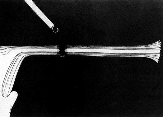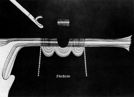 Mechanical Techniques CLIP. Two nonelectrical (mechanical) laparoscopic tubal occlusive techniques have become popular in the past few years. Hulka and colleagues19 developed the spring-loaded clip. Aware of the high failure rate associated with the use of a previously developed tantalum clip (up to 27% according to Wheeless20), yet still fascinated by the simplicity of the concept, Hulka and associates spent years developing a clip of Lexan (Richard Wolf Instrument Corp., Rosemont, IL) plastic jaws held in place by a gold-plated stainless steel spring, which is thought to reduce peritoneal reaction. The basic principle involved in this technique is that the plastic jaws with interlocking teeth leave no spaces. The maximal pressure on the tube is applied over a period of time, thus lessening the acute crushing effect that could result in fistula formation (Fig. 8). This plastic clip, as opposed to the tantalum clip, supposedly leaves no room for recanalization. The original clip applicator was subsequently adapted to the operating laparoscope for single-puncture application. Later, Lieberman and co-workers,21 favoring the two-puncture technique, devised an appropriate applicator. Another clip, devised by Filshie and colleagues22 and introduced into the United States in 1997 (more than 10 years after its introduction into Canada and many other countries), is made up of titanium jaws lined with silicone rubber. Locking of the device is achieved by a flattening effect of the upper jaw, which locks into the lower hooked jaw. This locking occurs through the mesosalpinx and is easily visualized at the time of application and enclosure of the clip. This confirms that the entire diameter of the tube has been included within the jaws. Visualization of the hooked end of the lower jaw can actually be confirmed before locking. When locked in place, the clip leaves no space at all between the jaws, thus achieving complete tubal occlusion. Compared to the Hulka clip, the Filshie clip appears to be easier to position properly before closure. In addition, because of its length, the Filshie clip can be placed on almost any fallopian tube, regardless of thickness or shape, including postpartum tubes. FALOPE RING. The Falope ring, devised by Yoon and King,23 is ingeniously simple. A loop of tube is drawn into the central hollow cylinder of the ring applicator forceps (single- or double-puncture technique) by gentle squeezing of the applicator handle. The loaded Silastic band is then forced down over the loop of tube by the forward action of an outer cylinder by a further squeezing of the applicator handle. This results in the release of the band from the applicator onto the loop of tube, thus achieving tubal occlusion. The portion of the tube encircled by the ring gradually becomes sclerosed, and the proximal and distal segments of tube become occluded (Fig. 9).