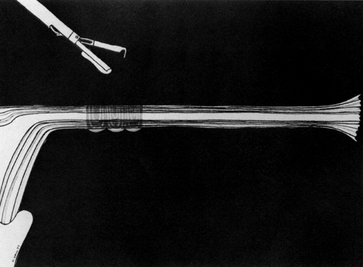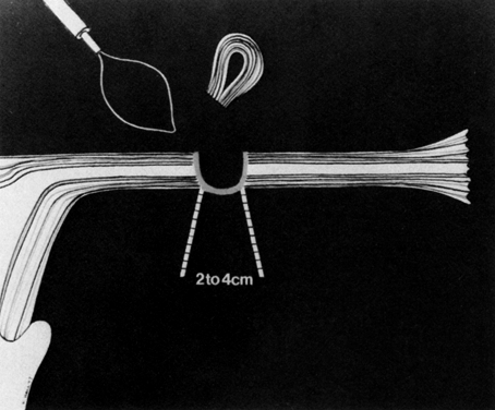 The advantage of this technique is that the current is markedly reduced from the exit potential of the standard electrical wall outlet and is therefore much safer. The apparatus employed for this thermocoagulation procedure requires no more than 4 or 5 V to produce the desired effect. With some of the sophisticated and automated thermocoagulation generators, the desired temperature and duration of current application may be preselected. Other generators provide an audible signal that varies according to the temperature of the heating element, indicating whether the instrument is in the heating or cooling cycle. Thermocoagulation now appears to be less dangerous than electrocoagulation; however, data regarding the efficacy of thermocoagulation are not yet available. Electrocautery The Waters Instrument Company18 devised another approach that employs the heating principle to produce coagulation as well as transection of the tube. This apparatus possesses a small, metallic hook that is heated by electric current produced in a battery-operated power source. The tube is grasped with the hook and pulled into an insulated outer sheath. The tube is coagulated and transected with hemostasis achieved by cauterization. Tissue destruction with this technique is minimal, but because sectioned ends of the tube remain in close proximity, recanalization may theoretically occur more easily than with some of the other techniques described (Fig. 7). Unfortunately, data for evaluating the true failure rate of this method are not available.