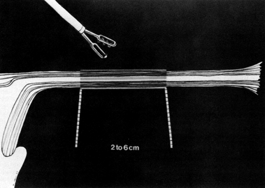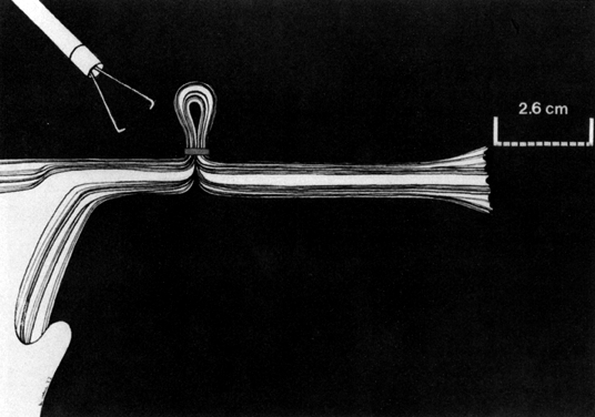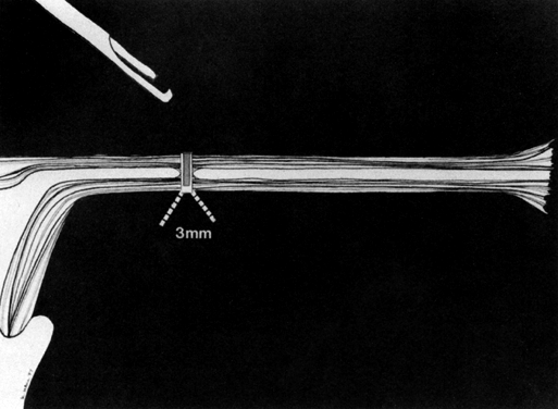 When the tubes are slender and lie free (i.e., are not involved in an adhesive or old inflammatory process), they are easily drawn up within the inner cylinder. When a thick or edematous tube is encountered, however, a slow “milking up” of the tube by means of a to-and-fro motion of the applicator handles is usually necessary in order to draw the tube into the hollow central cylinder. In doing so, the serosa may be damaged, or the tube may be totally transected (“click sign” of Levinson), thus increasing the risk of fistula formation, as with the Madlener technique. In addition, there is also the potential for bleeding from the transected tube. |
