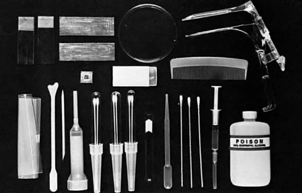 A past history is helpful. The patient should be asked if she has any allergies. Any hepatic disease or blood clotting problems may influence postcoital treatment. In addition, the last menstrual period, gravidity, parity, and the method of contraception, if any, should be documented. The date of the last consensual intercourse is essential because sperm from this encounter may still be present in the vaginal canal and cervix and confuse the issue. Whether or not she has had any recent gynecologic surgery may be significant if blood is present. The patient should be asked if she has ever had hepatitis or venereal disease. If so, she should be asked if she was treated for it, when she was treated for it, and what medication was used. It is also important to learn if the patient has douched, voided, defecated, or bathed since the attack. The history of the attack should include the presence or absence of violence. If there was physical abuse, of what type and how severe was it. If a weapon was used, what kind was it. The presence of a weapon can explain the lack of physical trauma to the patient, because few patients will fight if the attacker has a knife or a gun . . . and rightly so. The patients with the most severe trauma are often the “fighters.” Was the patient restrained? If so, what was used? These facts are significant because they tell the physician what to look for (e.g., discolorations on the skin, rope burns, and abrasion). How many attackers were present? What did they look like (e.g., color, race, language)? Did the victim know the assailant? Was he a relative? These latter bits of information are needed so that some of the myths about rape can be dispelled. The patient's own words should be used as much as possible and be put into quotation marks in the report. A general statement about the emotional state of the patient should be documented. Again, a too-detailed interpretation of her behavior can be prejudicial. A blood screening test for alcohol or drugs is not necessary unless requested by the police. The general inspection of the patient should be done in a good light so that injuries can be seen more easily. Some of the materials necessary to perform a proper physical examination are shown in Figure 2. It is not necessary to document findings not related to the rape. These findings may prejudice a jury. Although physical trauma is often not present, any ecchymoses, abrasions, contusions, scratches, and lacerations must be described accurately. The size of these lesions should be measured in inches so that the jury can appreciate it; at the present time the metric system is a mystery to many lay people, and they cannot visualize lesions that are measured in centimeters. Ecchymoses from gripping by the fingers of the offender are commonly found on the neck, upper arms, breasts, and medial aspects of the thighs.