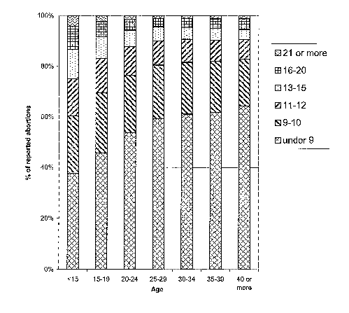 One of the most important factors in the evaluation of morbidity and mortality associated with induced abortion is the period of gestation at which the pregnancy is terminated. Although the traditional division has been between abortions in the first trimester and those in the second trimester, experience indicates that this dichotomy is not sufficient because morbidity and mortality increase with the progress of gestation, even within each trimester. In the United States, more than half (55%) of the abortions take place at 8 weeks from the last menstrual period or earlier, and an increasing proportion (18% in 1997) are performed before 7 weeks. Medical methods of early abortion by use of mifepristone or methotrexate in combination with the prostaglandin misoprostol are now available, and early vacuum aspiration, either manual or electric, is now accepted as safe. Contributing to these developments is the availability in clinics and physicians' offices of sensitive vaginal ultrasound equipment for assessing pregnancy and ensuring that the uterus is empty after the procedure. In 1997, 12% of abortions occurred after 12 weeks, including 1% after 20 weeks. Under extraordinary circumstances, abortions may be performed after 24 weeks; a reasonable estimate is that there are on the order of 1000 such abortions a year. Many of these follow the discovery of fetal abnormalities. Abortions past 12 weeks occur most frequently among the youngest women, as shown in Figure 1. The strong inverse association of period of gestation and a woman's age probably reflects the inexperience of the very young in recognizing the symptoms of pregnancy, their unwillingness to accept the reality of their situation, their ignorance about where to seek advice and help, and their hesitation to confide in adults. Economic considerations and, in many states, regulations prohibiting abortions for minors without parental consent or notification or a court order also contribute to delays.