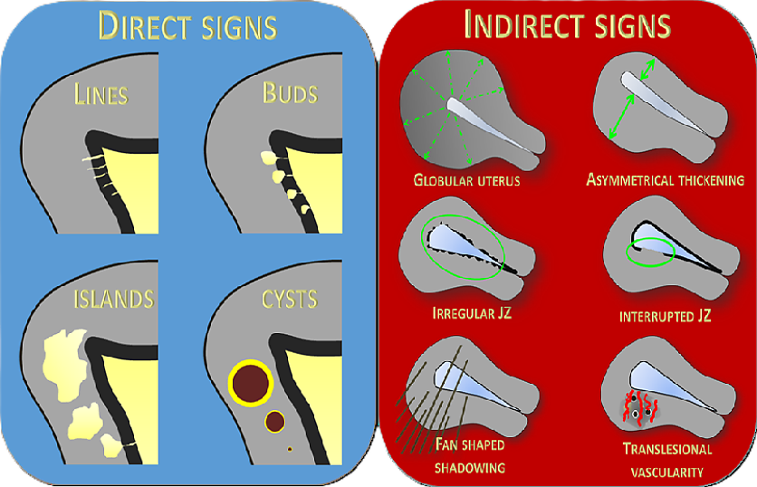 - For the diagnosis of adenomyosis, assess for both direct features and indirect features of adenomyosis.