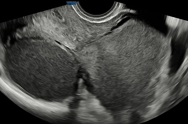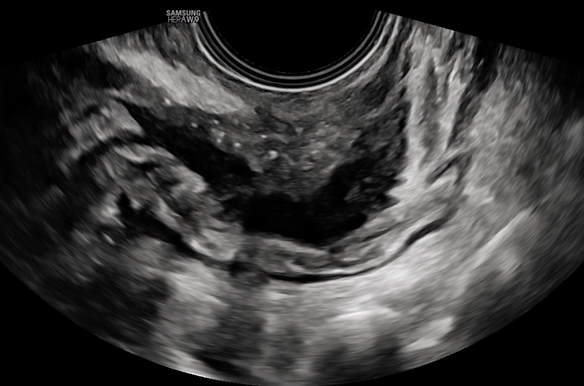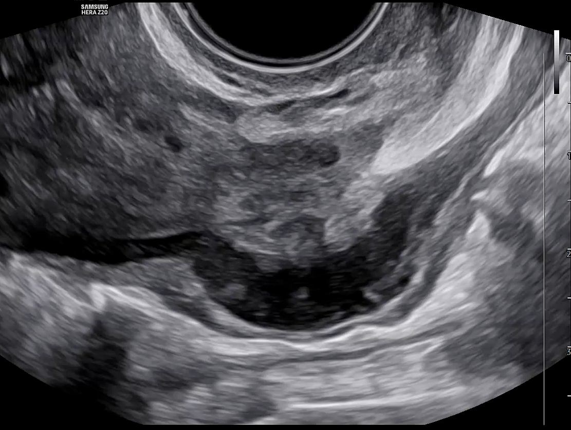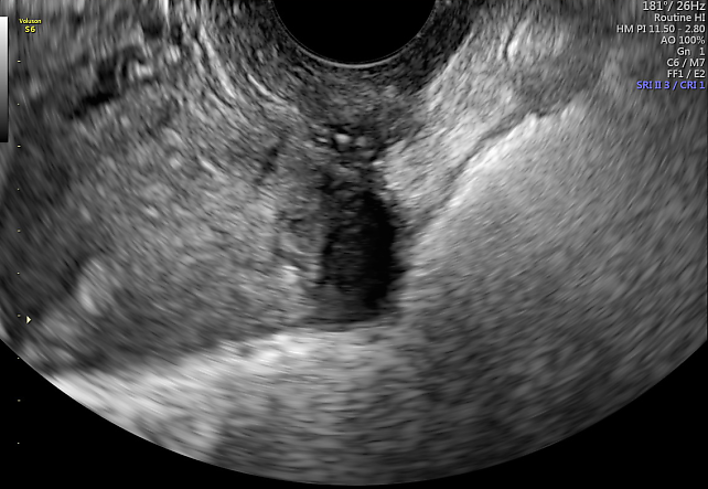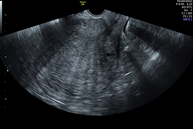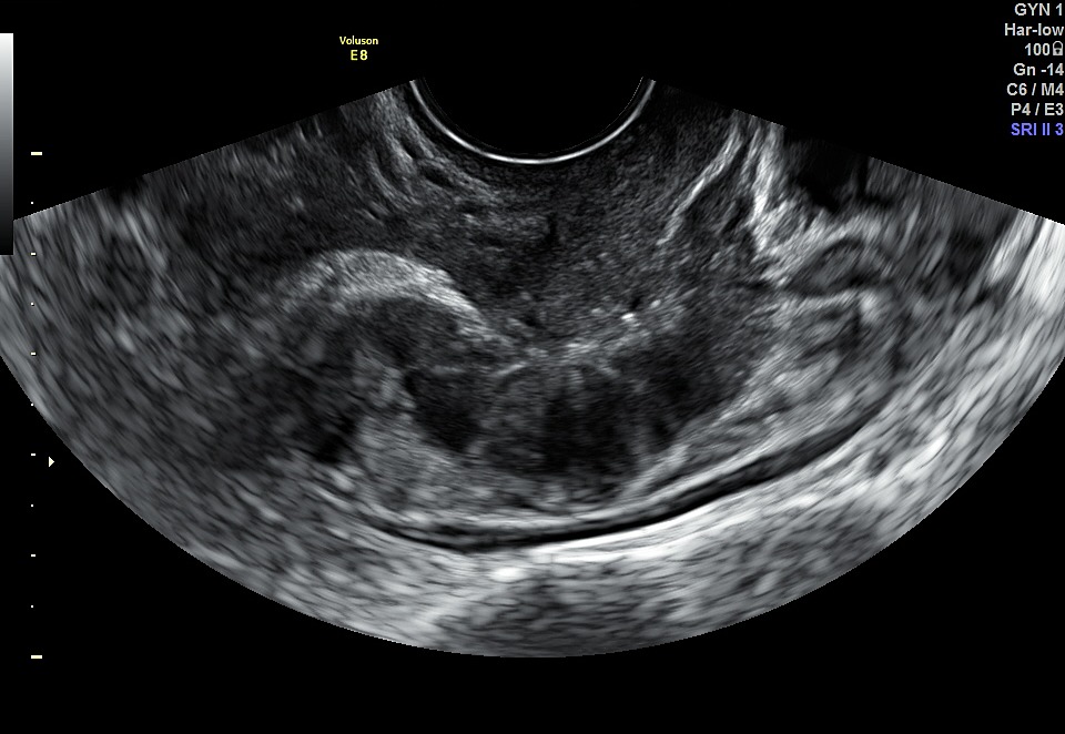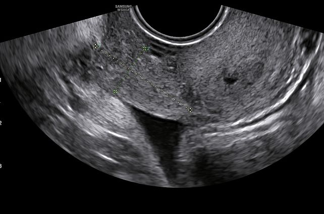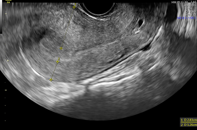 Ultrasound image showing asymmetry between the anterior and posterior myometrium and an irregular junctional zone. This is indicative of moderately diffuse adenomyosis, Type 1–2.