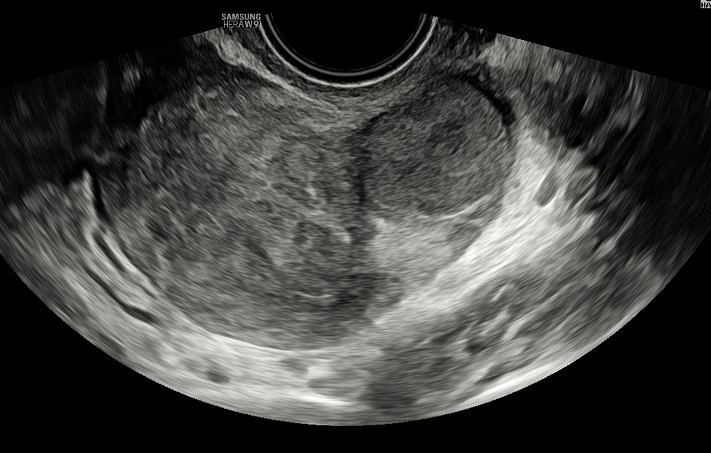 Well-circumscribed adenomyoma in a 27-year-old patient, presenting as a heterogeneous, hypoechoic intramyometrial lesion.