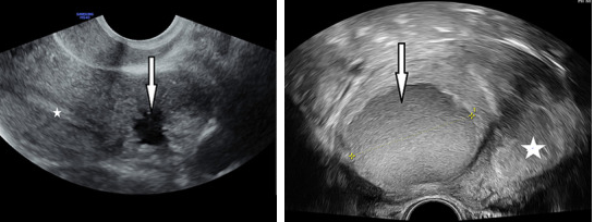Ultrasound images of accessory cavitated uterine malformation (arrows), with uterine cavity denoted by star.25