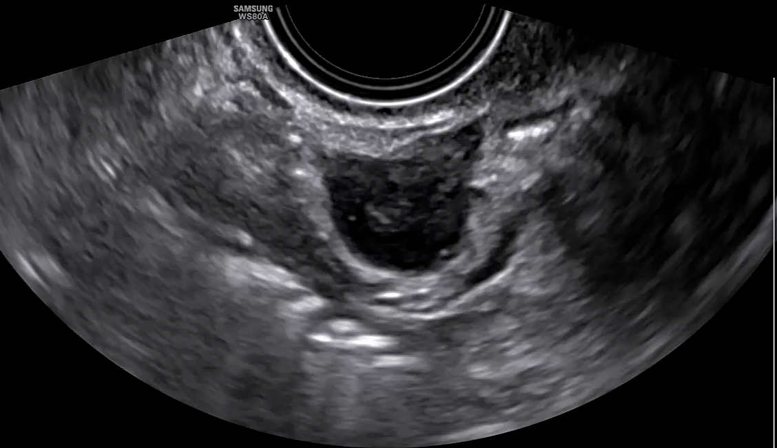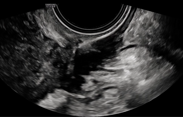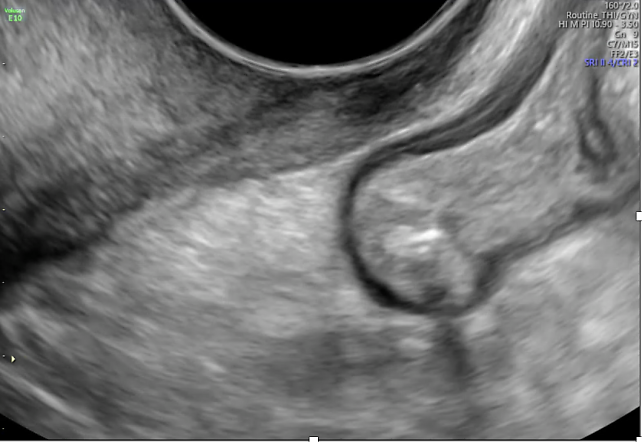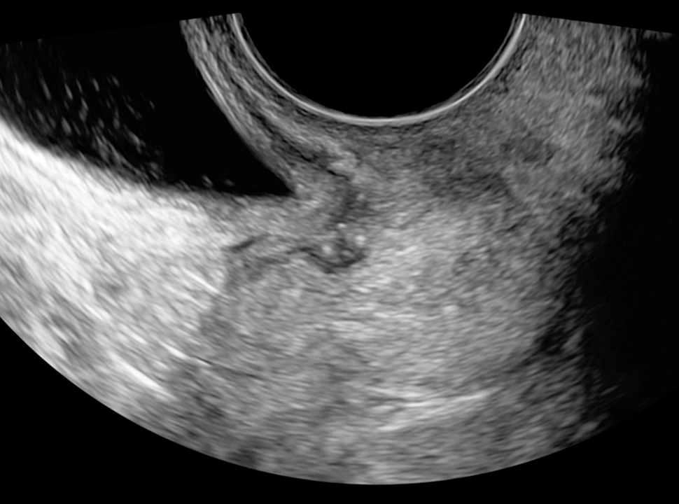 Ultrasound image of focal adenomyosis with a hypoechogenic nodule in the posterior outer myometrium, adherent to the distal bowel.