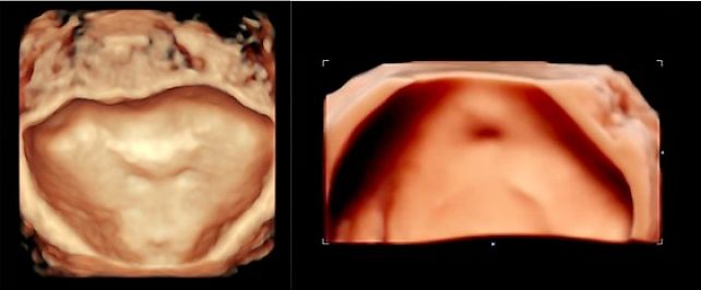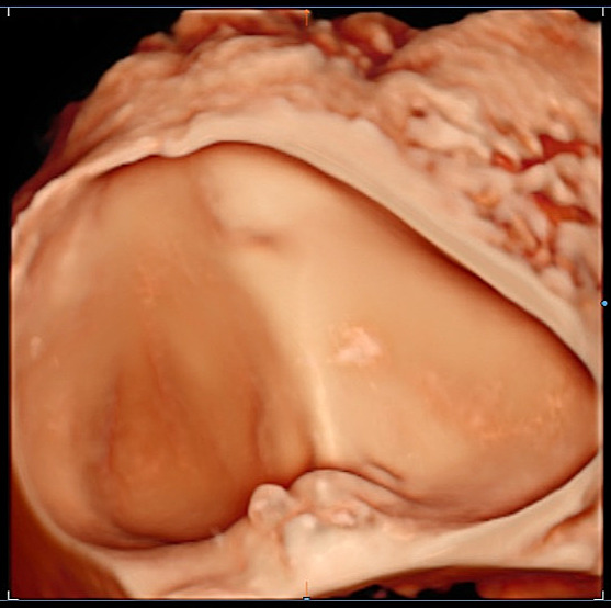 Transabdominal three-dimensional ultrasound image (3D) of the urinary bladder triangle demonstrating normal anatomy.