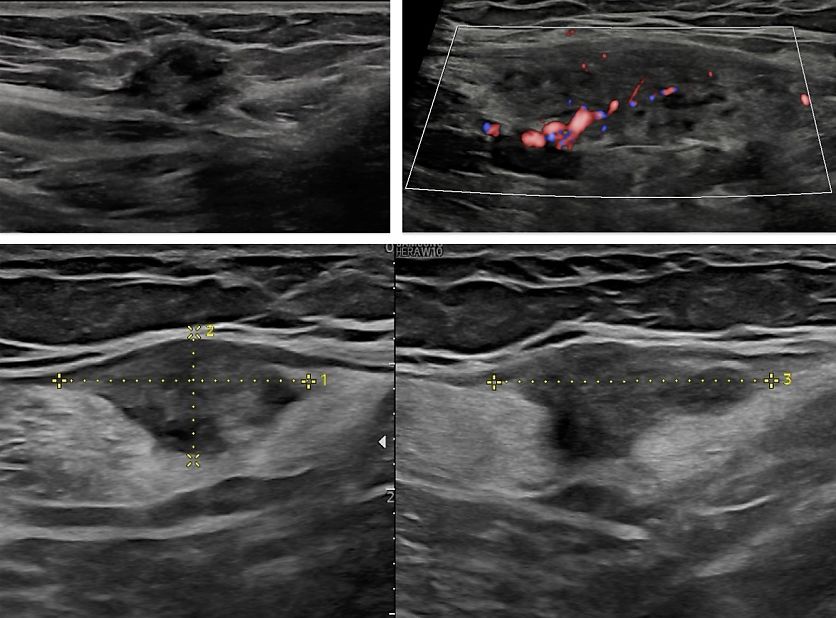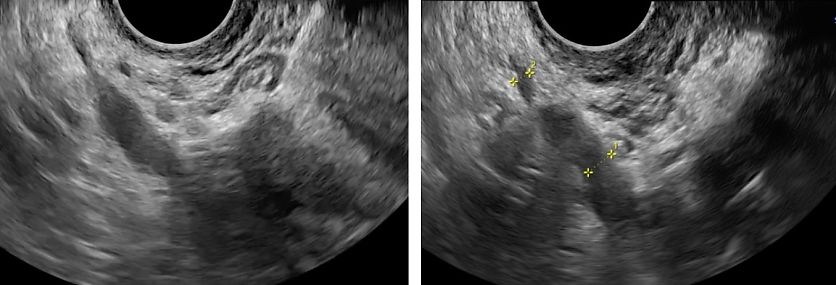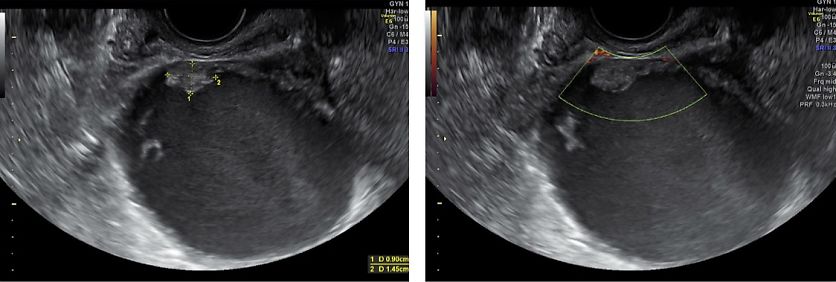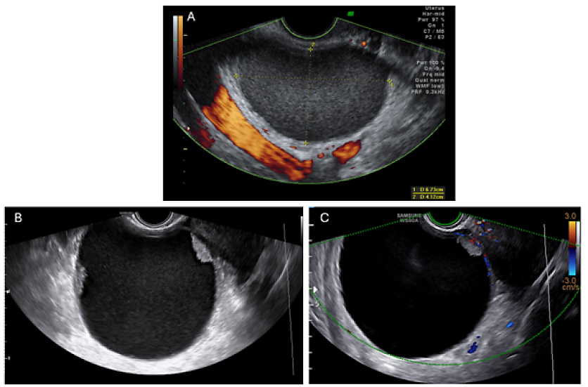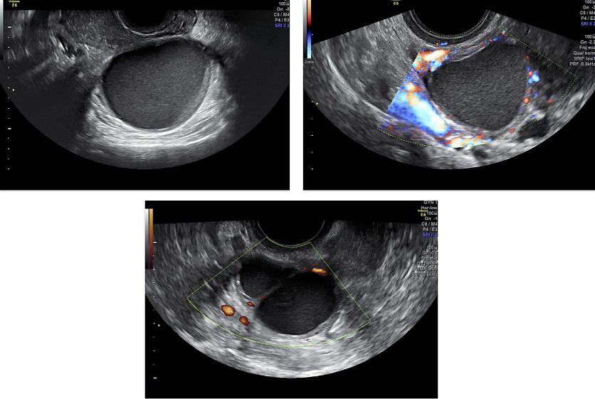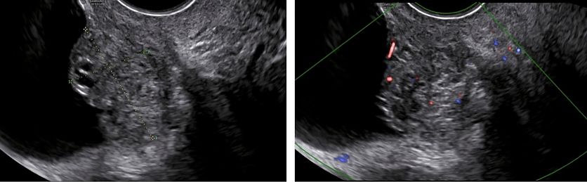Color Doppler can help distinguish between fibrotic and vascularized lesions (Figure 12). When ultrasound findings are ambiguous, or when the nodule is situated cranially, transabdominal ultrasound or MRI may be used as complementary tools.31,3