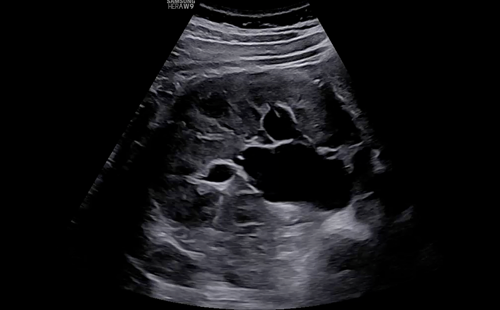 The distal ureters can be identified laterally and posteriorly to the uterine arteries in the longitudinal plane. Deviation, thickening or reduced mobility of the ureter at this level should raise suspicion of UE involvement. Assessment of ureteral jets with color Doppler is recommended to confirm ureteral patency. In cases of hydronephrosis or loss of ureteric visualization, further imaging, such as renal ultrasound (Figure 14), computed tomography (CT) scan or MRI scan, should be considered.32