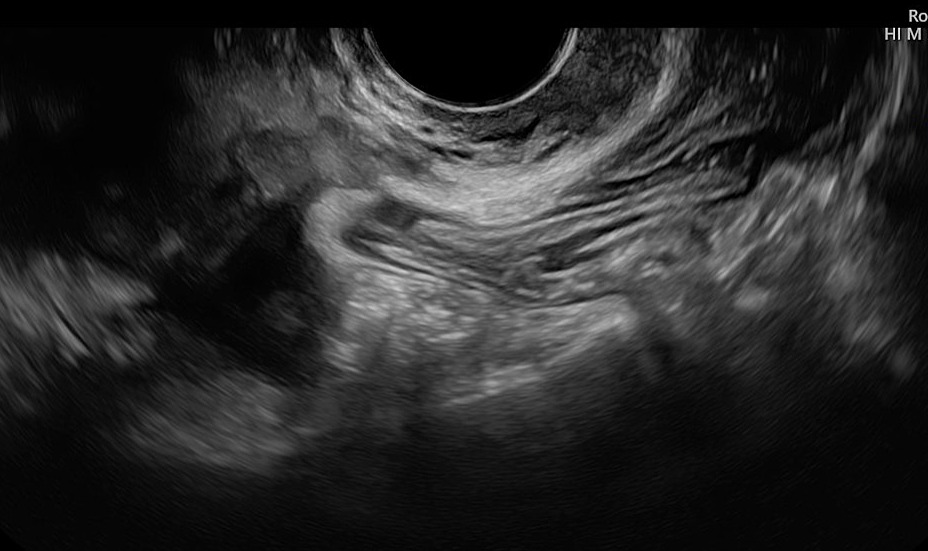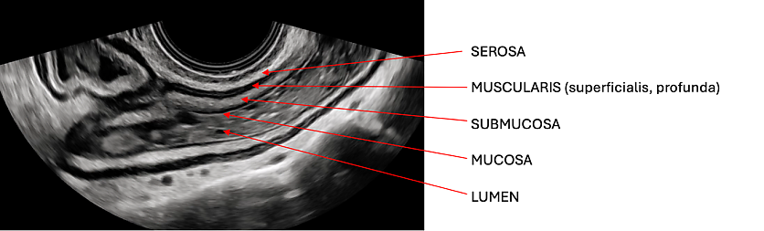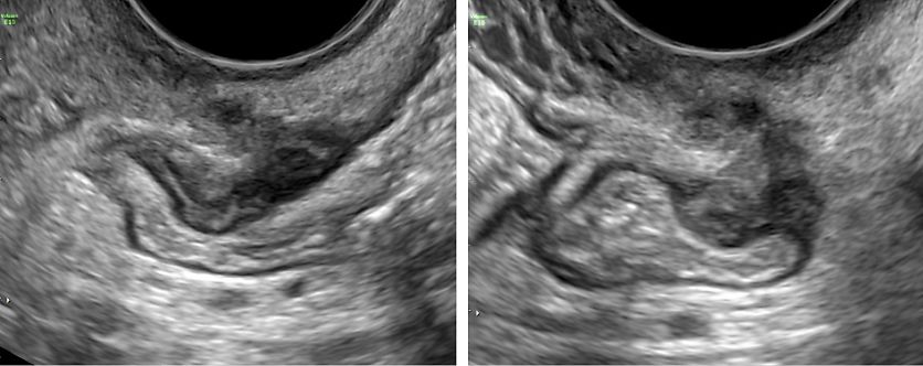 DE involving the bowel, most commonly the rectum and sigmoid colon, is a key aspect of posterior compartment disease. Accounting for up to 90% of intestinal endometriotic lesions, it may present with dyschezia, constipation, cyclic rectal bleeding or tenesmus in cases of low rectal involvement. The bowel has a layered appearance on ultrasound (Figure 16). TVS performed by experienced practitioners is considered the primary imaging technique for preoperative assessment.5,38
