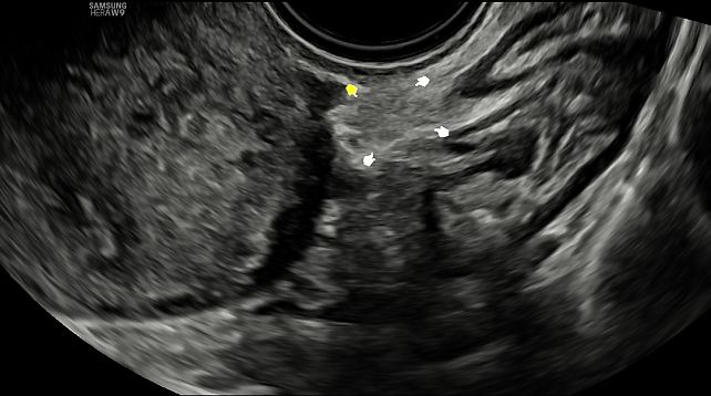 - Focal adenomyosis in the outer myometrium (FAOM). In these cases, there is an ill-defined, predominantly hypoechogenic nodule located in the outer myometrium (external to the arcuate vessels), often with acoustic shadowing and minimal/no vascularization (Figure 4). There is a strong correlation between the presence of FAOM and DE, particularly in the posterior compartment, as well as in the vesicouterine area.23,24 It is hypothesized that aggressive endometriotic lesions not only infiltrate the bowel, posterior vaginal wall, ureters and bladder, but also extend into the outer uterine myometrium. The close association between FAOM and DE may result from shared pathogenic pathways between these two conditions.24