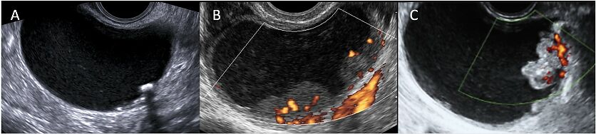 Transvaginal ultrasound images (B-mode and color Doppler) of unilocular solid masses evaluated during pregnancy: (A) cystadenofibroma; (B) endometrioma; (C) serous borderline ovarian tumor. These images allow the comparison of different types of papillary projection: (A) the papillary projection appears regular, hyperechoic and associated with posterior acoustic shadowing; (B,C) both papillary projections show moderate vascularization on color Doppler; however, the papilla in (B) has a smooth and regular contour, whereas the papilla in (C) has an irregular contour.
