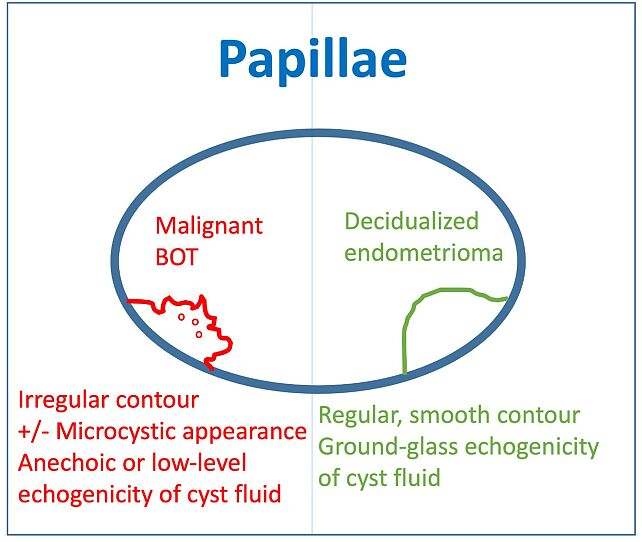 - Ultrasonographic assessment of papillary projections should consider surface morphology: smooth and regular papillae with ground-glass echogenicity are more consistent with decidualized endometriomas, whereas irregular papillae with microcystic changes and anechoic or low-level echogenic fluid are more suggestive of borderline ovarian tumors.