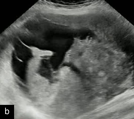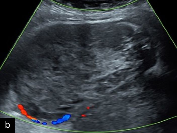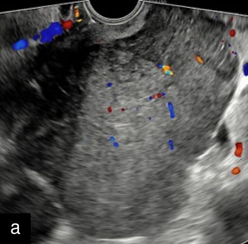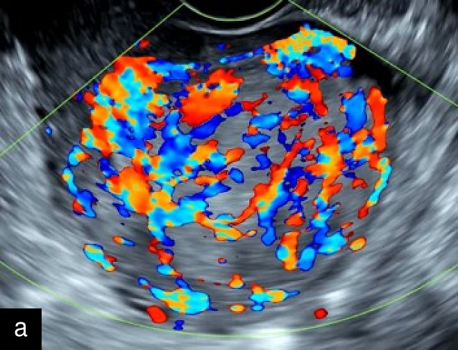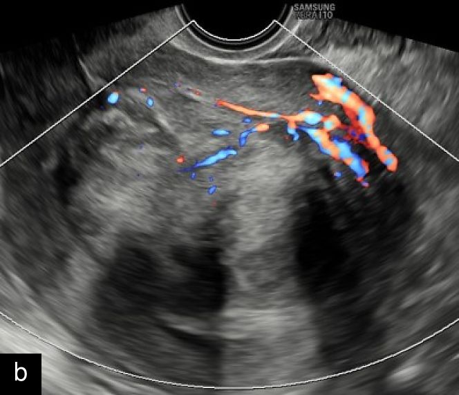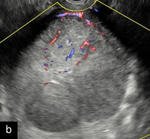 Transvaginal (a) and transabdominal (b) ultrasound images of uterine sarcoma. The lesion exhibits heterogeneous echotexture, irregular margins and peripheral vascularity on color Doppler. While uterine sarcomas are often highly vascularized, cases with lower vascularization can pose challenges in the differential diagnosis from benign myometrial lesions, such as atypical leiomyomas.
