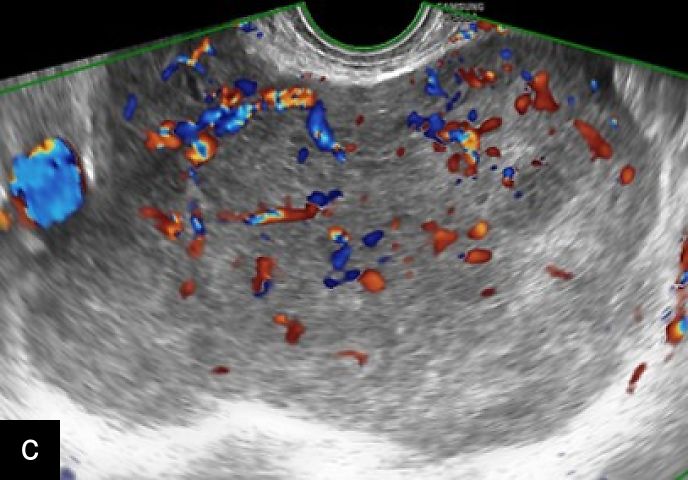 Transvaginal ultrasound images with color Doppler of uterine sarcoma, demonstrating heterogeneous echotexture and irregular margins. The Doppler assessment reveals variable vascularization patterns, ranging from moderate (a–b) to extensive (c) intralesional blood flow. Images (b) and (c) show the 'cooked appearance' of solid tissue, a sonographic feature defined by the lack of structure of the solid component and the absence of acoustic shadowing.