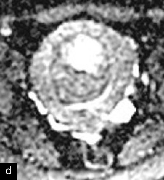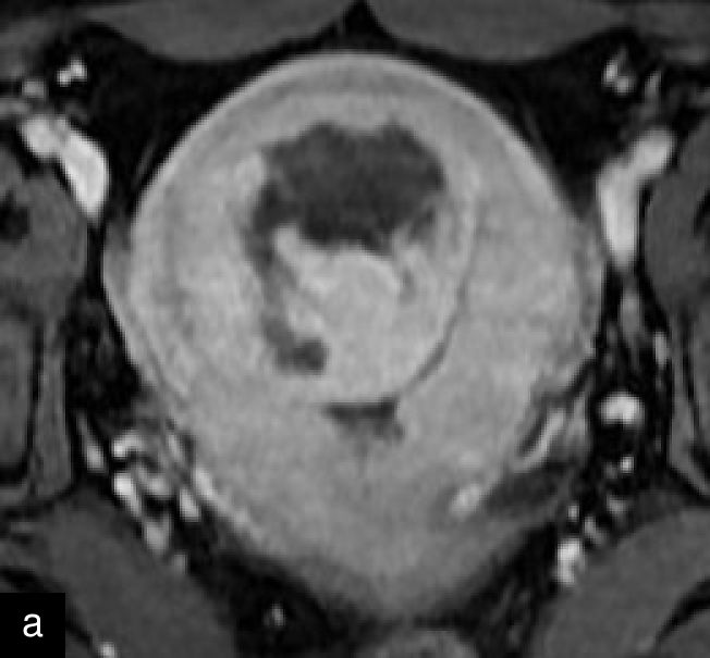 Magnetic resonance imaging (MRI) of a STUMP. (a) Contrast-enhanced MRI showing heterogeneous enhancement of the mass. (b) T2-weighted MRI demonstrating a hyperintense lesion with heterogeneous signal intensity. (c) Diffusion-weighted imaging (DWI) highlighting areas of restricted diffusion. (d) Apparent diffusion coefficient (ADC) map, showing low ADC values suggestive of increased cellularity, aiding in the differentiation of STUMP from benign leiomyomas and malignant leiomyosarcomas.