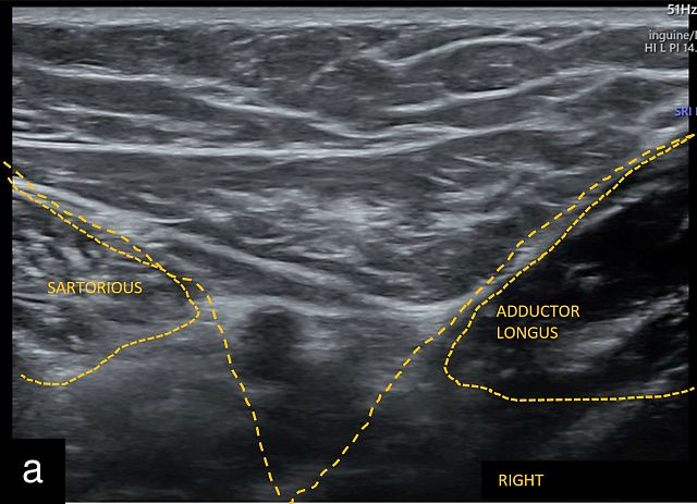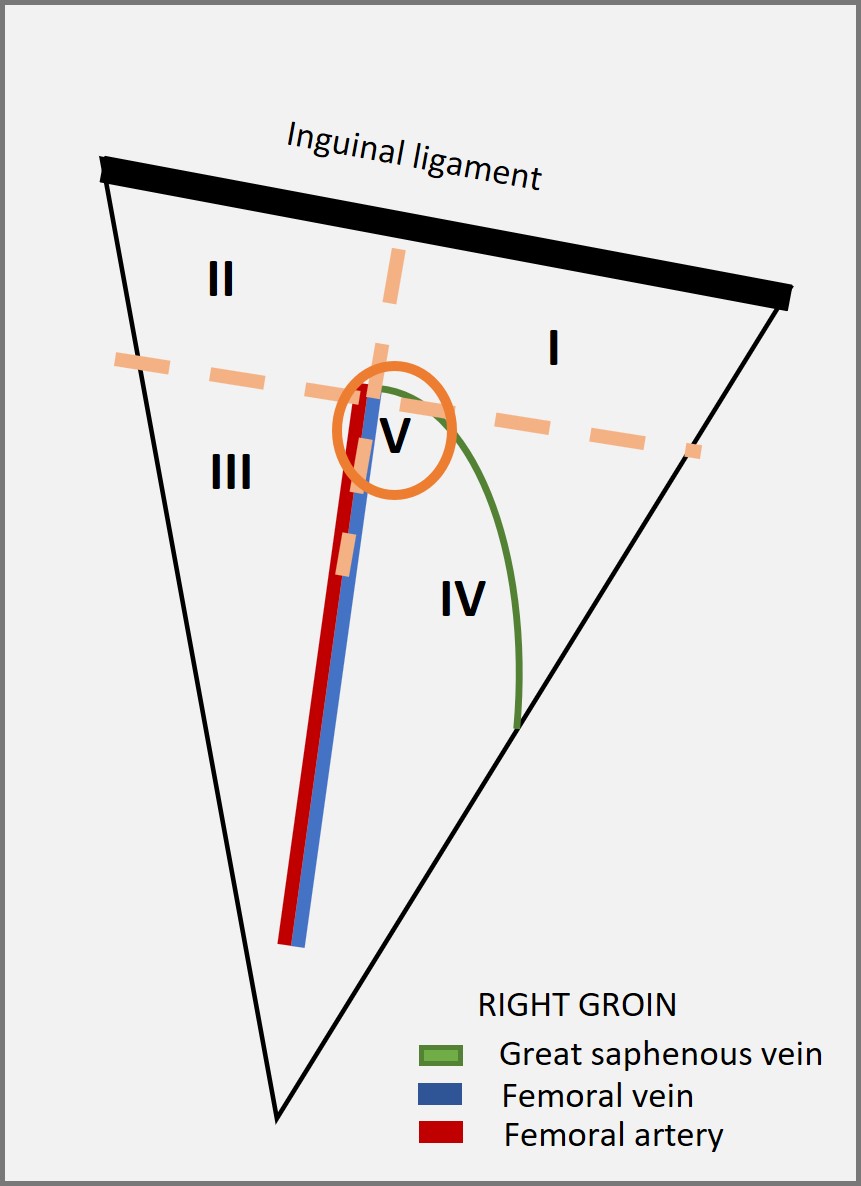 - the apex of the femoral triangle, located at the intersection of the sartorius and adductor longus muscles (‘V sign’) (Figure 1a)
