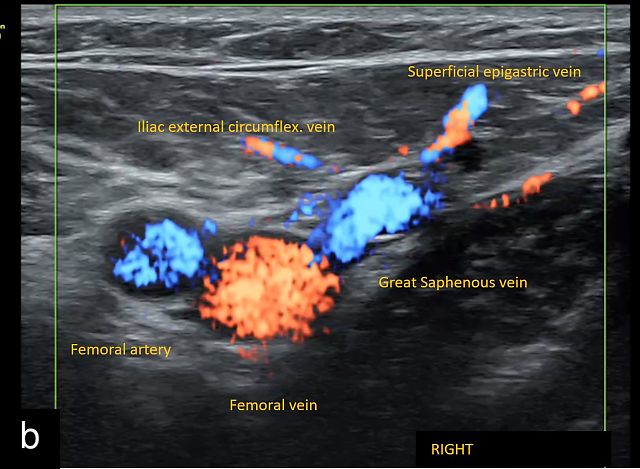 - the saphenofemoral junction, visible in transverse section with the tributary veins of the great saphenous vein (‘snail sign’) (Figure 1b)