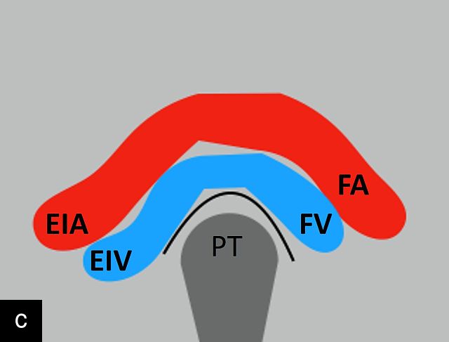 Anatomical landmarks for location of the inguinal lymph nodes on ultrasound. (a) Valley or V sign. (b) Snail sign. (c) Hill sign. EIA, external iliac artery; EIV, external iliac vein; FA, femoral artery; FV, femoral vein; PT, pubic tubercle
