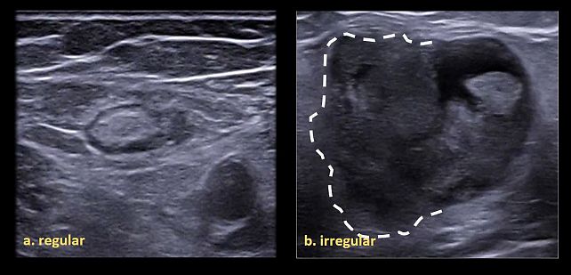 - Shape: described as regular (oval/elliptical or round) or irregular (lobulated or with spicules on the outer margin) (Figure 3).