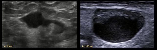 Lymph node cortical thickening, defined as focal (a) or diffuse (b).
