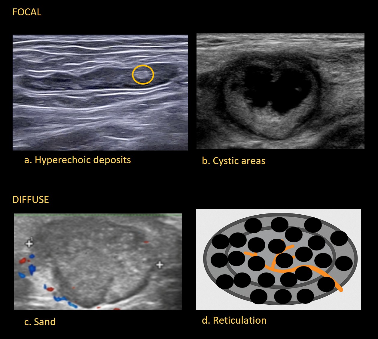 Abnormal lymph node echogenicity, defined as focal with hyperechoic deposits (a) or cystic areas (b), or diffuse with sand pattern (c) or reticulation (d).
