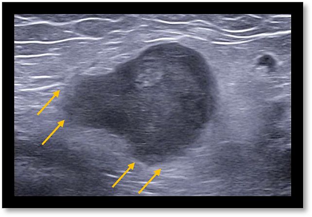 - Perinodal hyperechogenic ring: a bright rim around the node, not limited to the posterior region, indicative of a desmoplastic reaction (Figure 9).