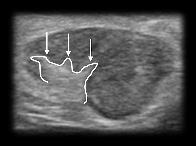 - irregular margins or hyperechogenic ring, as a sign of extracapsular spread due to metastatic involvement (Figure 14)