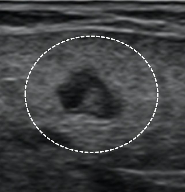 Pelvic (external iliac) lymph node, visualized using a convex probe, showing cystic area (dashed circle).