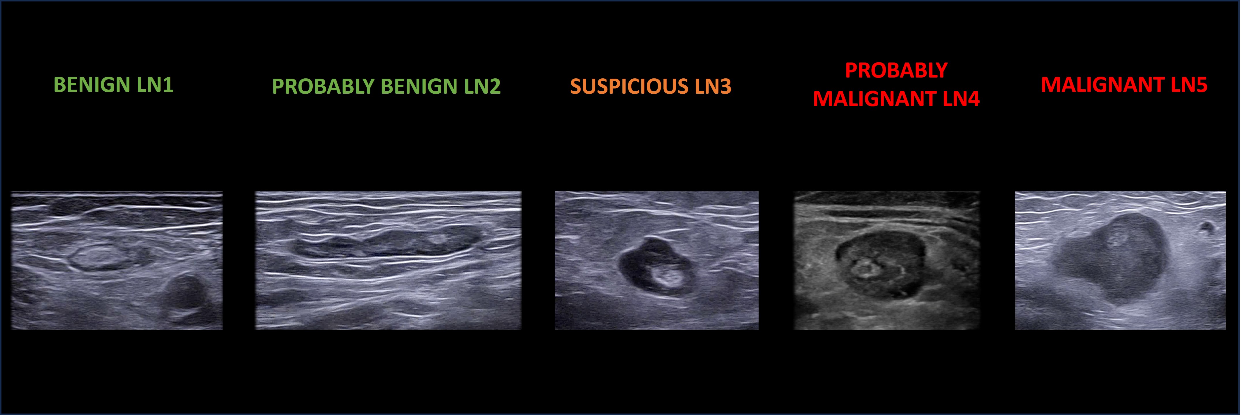 A subjective assessment, based on the combined evaluation of dimensional, morphological and vascular characteristics, allows the operator to classify each lymph node from LN1 (normal) to LN5 (metastatic) (Figure 12).