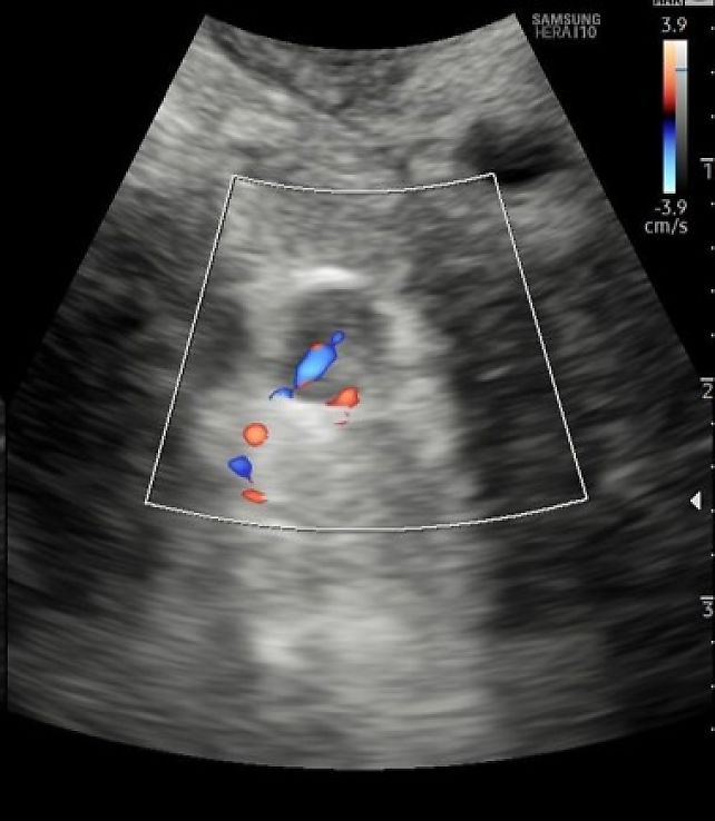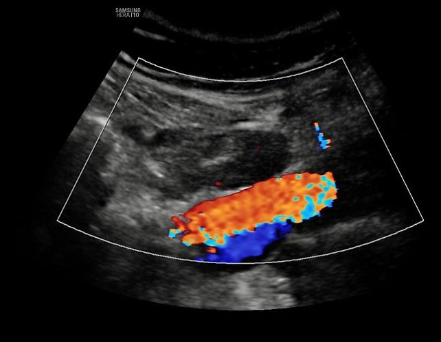 Using Doppler (color or power), with pulse repetition frequency (PRF) set at 0.3–0.6 kHz and with minimal probe pressure, the vascularization score (1–4) is assigned as per IOTA guidelines.22 Blood vessel architecture is described as: hilar (central, parallel to long axis) (Figure 11a), transcapsular (vessels penetrating from the outside) (Figure 11b) or combined (both patterns).