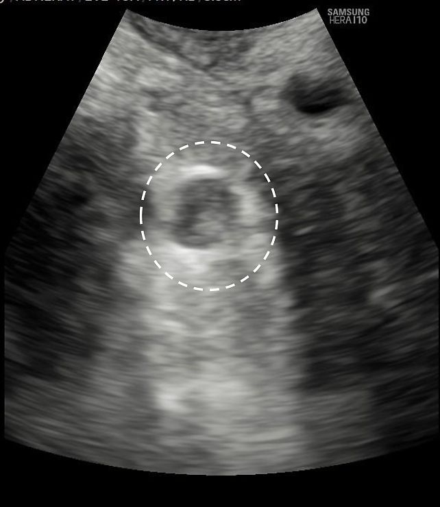 Hyperechogenic ring, raising suspicion of metastasis, visualized using a convex probe.