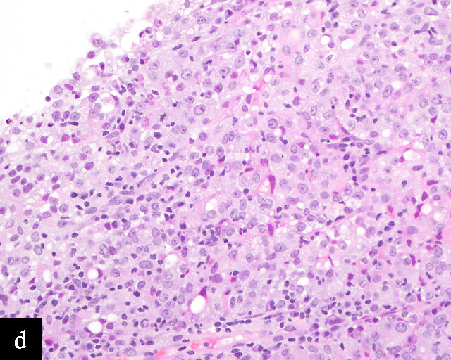 Gastric-type adenocarcinomas frequently present at a late stage (parametrial involvement, ovarian and lymph node metastasis) with unfavorable histopathological features (lymphovascular invasion and positive peritoneal cytology) and significantly worse disease-free and overall survival compared to HPV-associated endocervical adenocarcinomas.24 Macroscopically, these tumors have been associated with a ‘barrel-shaped’ cervix, attributed to deep invasion and induction of desmoplasia, leading to diffuse enlargement and thickening of the cervix.25 The histological appearance of these tumors is diverse. Well-differentiated forms (Figure 2c) can be difficult to distinguish from non-lesional cervical glands, which is reflected in the older terminology ‘adenoma malignum’ and ‘minimal deviation adenocarcinoma’. These historically referred to gastric-type adenocarcinomas that exhibit bland morphological features.22 In contract, poorly differentiated tumors can display variable architectural patterns, ranging from irregular incomplete, glands to solid nests or single cells in which glandular differentiation is not readily evident26 (Figure 2d).