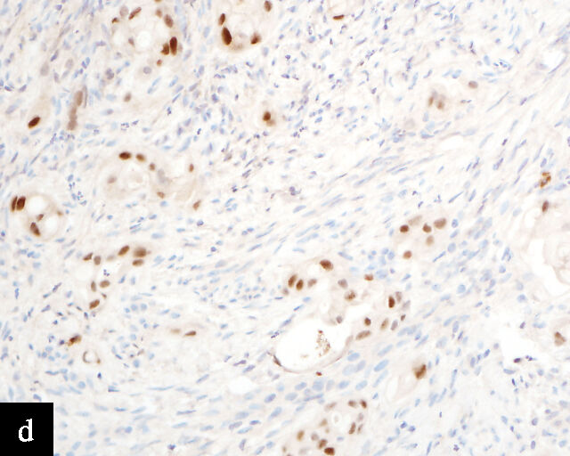 Clear cell adenocarcinomas of the cervix follow a bimodal age distribution. The first peak is observed at late adolescence/early adulthood13,14 and is associated with in-utero exposure to diethylstilbestrol (DES). The median age at presentation for clear cell adenocarcinoma not related to DES exposure is 48 years15 and constitutes the second peak. Its histological appearance resembles that of clear cell adenocarcinomas from other parts of the female genital tract (uterine corpus and ovaries), in particular tumor cells displaying overt nuclear atypia and a characteristic clear cytoplasm, arranged in variable destructive growth patterns16 (Figure 2a). Clear cell adenocarcinomas of the cervix share common immunophenotypic features with upper female genital tract carcinomas, notably PAX8 positivity and non-diffuse p16 expression17 (Figure 3a,b). Limited data from case series indicate that mutations in CMTM5 and WWTR1 are relatively frequently detected in clear cell adenocarcinomas of the cervix.18,19
