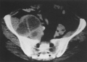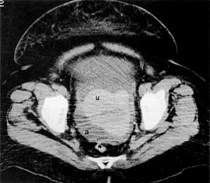 Axial CT scan of the pelvis in a 55-year-old woman with stage IB cervical carcinoma causing obstruction of the uterus (u). (b, bladder; arrows, uterus; r, rectum.)