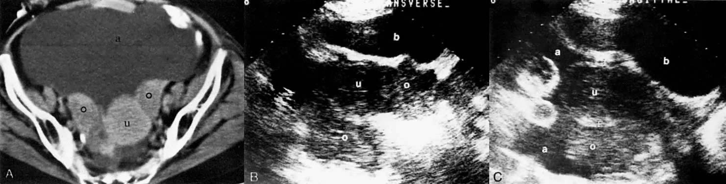 Ovarian adenocarcinoma involving both ovaries (o) and uterus (u) with ascites (a). CT scan of the pelvis (A) shows bilateral ovarian masses with ascites and uterine involvement on the left. Transverse (B) and sagittal (C) sonograms of the pelvis in a different patient show large, bilateral, irregular, and inhomogeneous ovarian masses inseparable from the uterus. Ascites is seen on the sagittal scan. The CT and ultrasound findings are consistent with at least stage II. (b, bladder.)