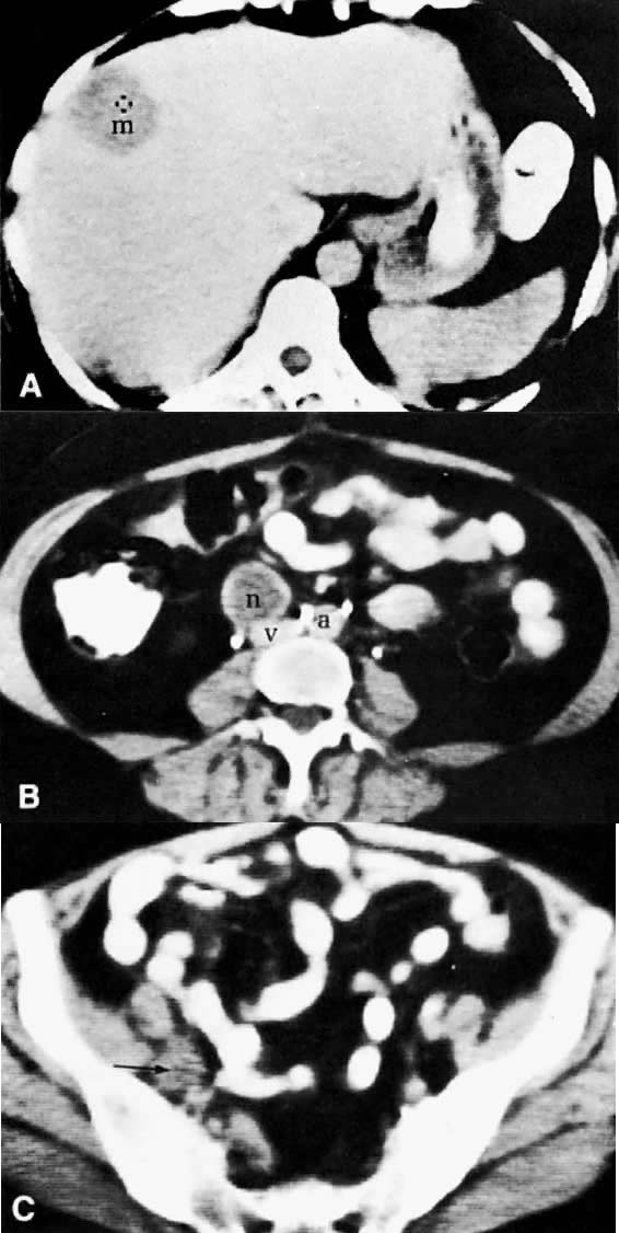 Metastatic granulosa cell tumor. A. CT scan of the upper abdomen shows a low-density, well-marginated mass (m) in the right lobe of the liver. B. Lower abdominal CT scan shows a necrotic paracaval mass (n) consistent with lymphadenopathy. C. CT scan of the pelvis shows an enlarged right external iliac lymph node (arrow) measuring 1.5 cm in diameter with some necrotic changes seen in its center. (a, aorta; v, inferior vena cava.)
